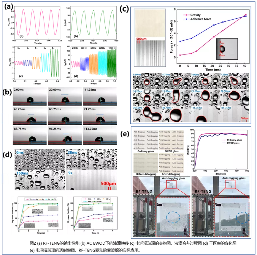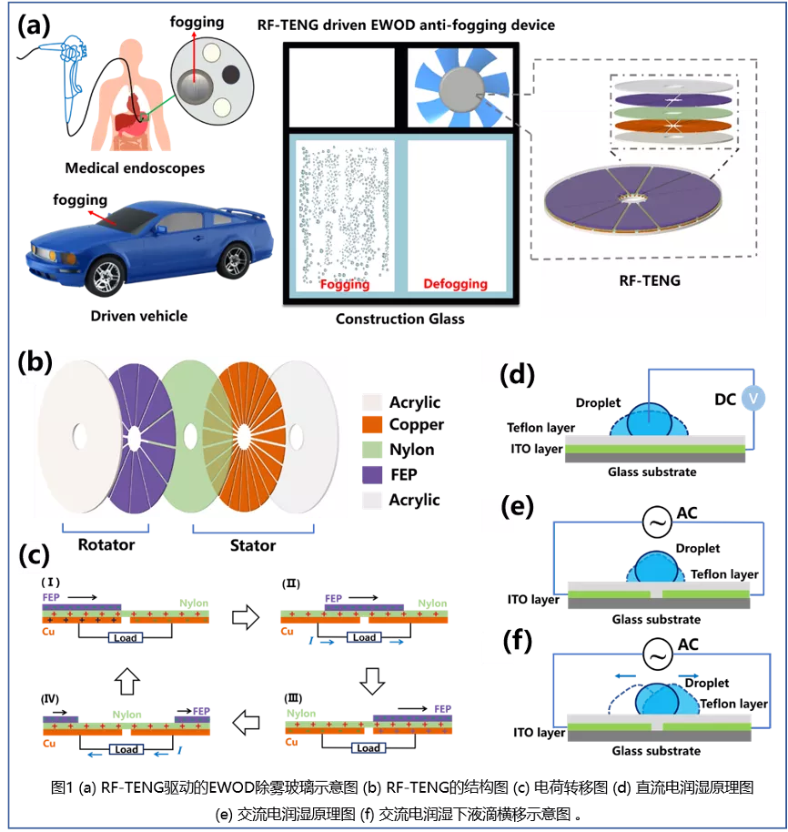 这项工作展示了由RF-TENG驱动的AC EWOD除雾玻璃,实现了超快速的玻璃除雾。与传统热风和超亲水涂层除雾方式相比,具有能耗低、速度快、耐久性强的特点,有望在汽车玻璃、医疗内窥镜、工业视窗玻璃除雾中取得应用。