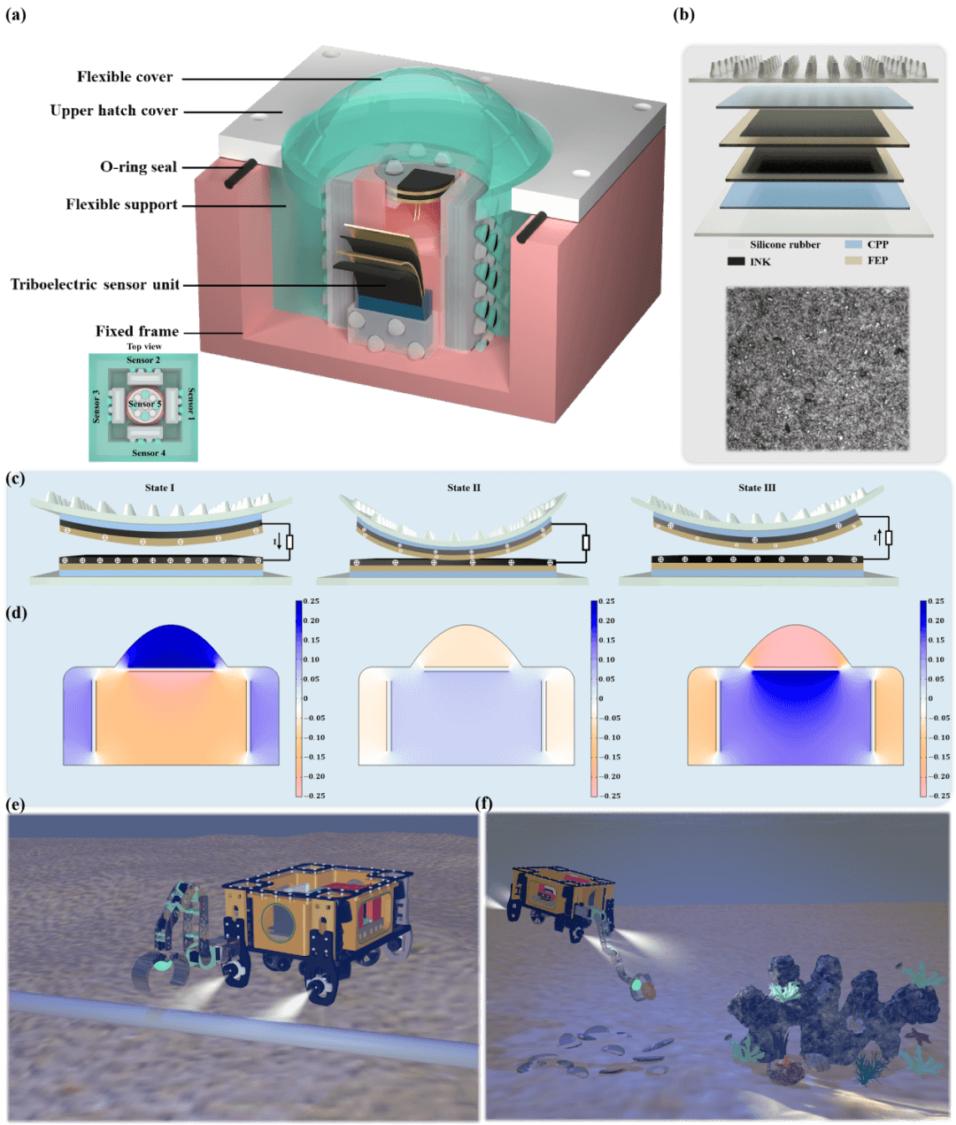 - 自主水下航行器 (AUV) 因其在水下的出色适用性而被使用,并且已经开发出不同的传感器设计来帮助 AUV 完成特定任务。尽管AUV可以完成众多任务,但它们仍然不是海洋领域日常工作中不可或缺的一部分。原因是缺乏具有与海洋动物相当的触觉感知能力。具有触觉感受器的海洋哺乳动物可以感知来自生物体运动的复杂刺激,当视觉信息减少或缺失时,海獭通过灵敏的爪子依然能够感知周围环境。这些动物行为学的发展可能为水下触觉传感器的结构设计提供方案。迄今为止,摩擦纳米发电机 (TENG) 还没有用于设计类似手掌的传感器来收集有关水下物体的物理信息。值得注意的是,基于TENG的传感器与触觉感受器类似,因为通常用于摩擦电传感器的软材料的杨氏模量与海洋哺乳动物手掌的杨氏模量处于同一水平。基于此,提出一款摩擦电手掌状触觉传感器可以为水下航行器提供收集有关物理对象信息的能力提供一种简单的方案。