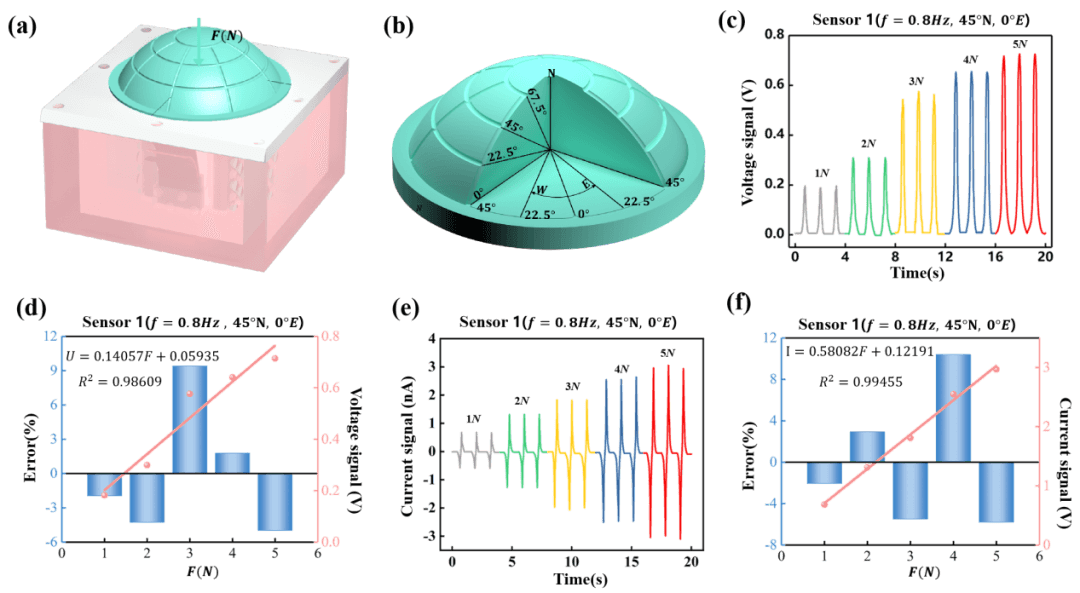 图2 传感器特性研究。(a)传感器单元在外部载荷下的变形图。(b)使用经度和纬度线在柔性盖表面上标注。(c)从1 N到5 N的响应外部负载的开路电压。(d)开路电压与外部负载大小的拟合线性关系。(e)从1 N到5 N响应外部负载的短路电流。(f)短路电流与外部负载大小的线性关系拟合。