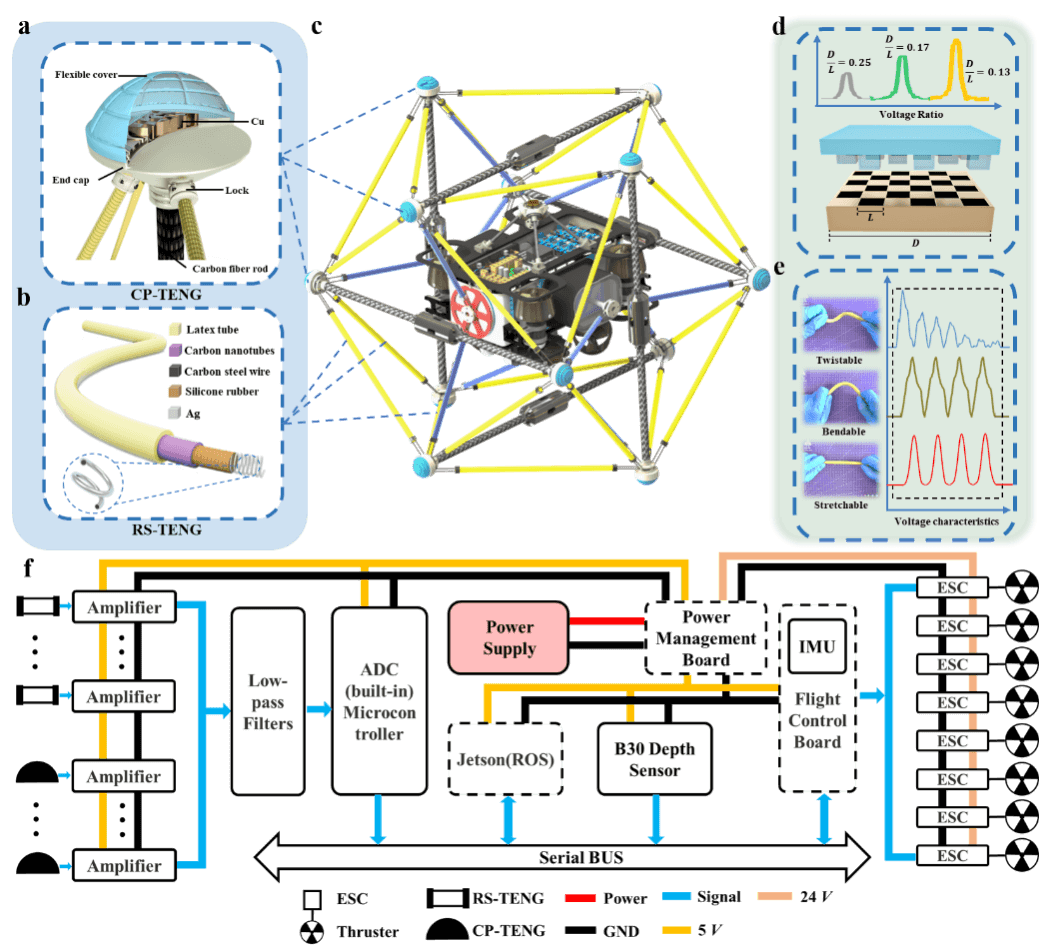 - 随着在海洋探索和研究中水下机器人应用的增长,迫切需要有效的三维触觉为水下机器人作业提供触觉反馈。张拉整体结构通常是由分离的刚性杆和张力元件构成,刚性杆通过连续的张力元件构成一个张力网络。这种轻型、多自由度和高动态顺应性的结构设计能够通过张力网络有效地重新分配载荷,允许系统被动地适应外界环境。这种能力可以使张拉整体通过其姿态估计来探索未知的水下环境,尤其是在狭窄的空间中光或声音存在反射问题时。此外,该轻型结构还可以提供高冲击弹性。摩擦纳米发电作为一种全新的机电转换方式,其最大优势在于能将环境中广泛分布的杂乱无章的机械扰动高效且自驱动地转换成电能或者电信号,因此在环境能量捕获和微扰动自驱动感知领域有广阔应用前景。因此,将摩擦纳米发电机与张拉整体结构相结合视为水下航行器在探索未知水下环境过程中可行的三维触觉感知方案。