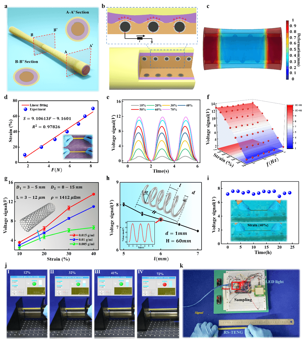 图2. 绳状可伸缩传感单元的工作机制和表征。(a) RS-TENG传感器的工作机制。插图:剖面图的放大图。(b) RS-TENG 传感器的电势分布。(c) RS-TENG传感器的变形模拟结果。(d) RS-TENG传感器的应力-应变曲线。插图:显示初始状态和 RS-TENG 传感器的照片。(e) 拉伸频率为 0.5 Hz 时 RS-TENG 传感器的输出电压信号,具有不同的拉伸应变。(f) 输出信号、应变和拉伸频率之间的关系。g, h RS-TENG 传感器的输出电压信号,具有不同的 (g) 碳纳米管 (CNT) 浓度和(h)钢丝的间距。(i) RS-TENG 传感器的水下稳定性。(j) 可视化界面和实验设置的示意图。(k) RS-TENG控制LED灯的实验。