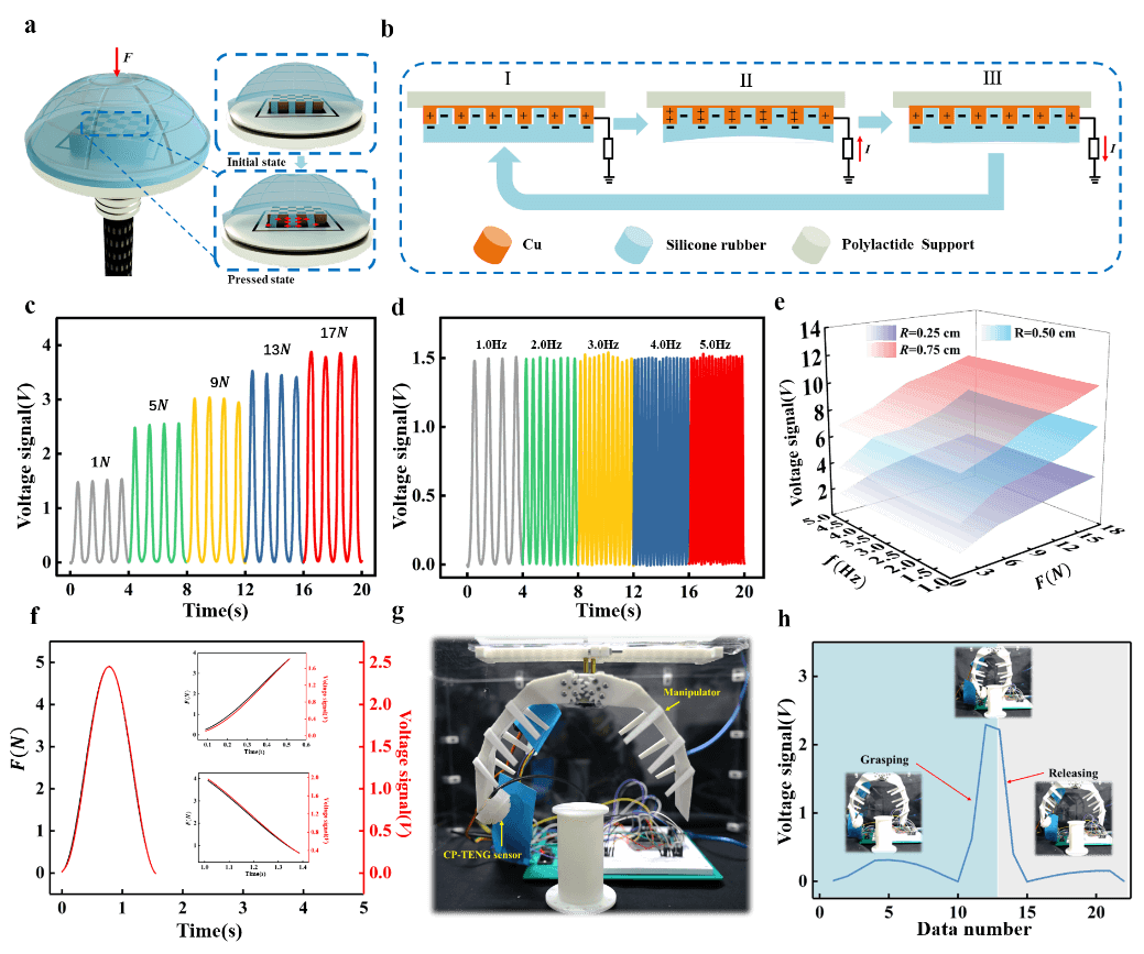 图3. 帽形传感单元的工作机制和表征。(a) CP-TENG传感器的工作机制。插图:压制过程的放大图。(b) 按下 CP-TENG 传感器时的电势分布。(c)(d)(e) 以不同的力按压 CP-TENG 传感器时的输出电压信号 (c) 1 Hz 按压频率下的力大小,(d) 1 N 恒定力下的频率,(e) 接触区域。(f) CP-TENG 传感器的响应时间测量。(g)(h) 集成到传感系统中以控制机械手和相应电压信号的 CP-TENG 传感器的照片。