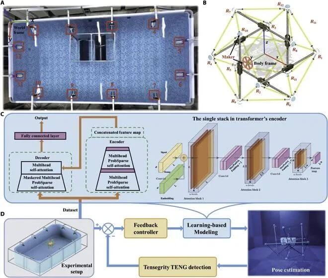 图4. 实验装置的组成部分。 (A) 动作捕捉区域。(B) U3DTT 的节点和考虑的参考帧。(C) 基于学习的模型概述。24 个 RS-TENG 传感器信号和 12 个 CP-TENG 传感器信号作为变压器网络的输入,映射到 12 个节点位置。(D) 反馈控制回路。通过这种学习的逆映射,所提出的触觉伺服控制器允许 AUV 在狭窄空间中发生光学或声波反射问题时自主探索周围环境。