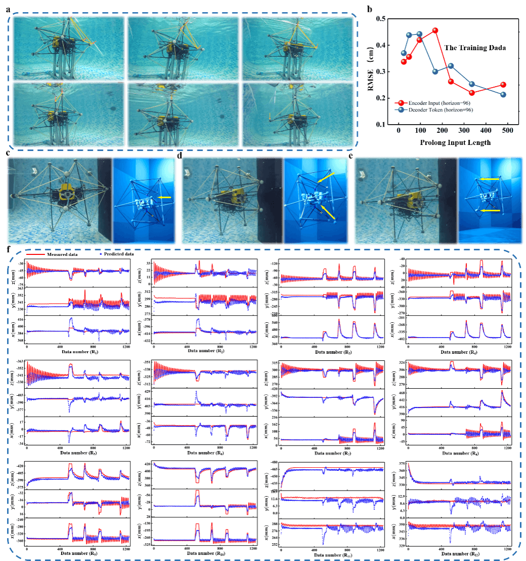 - 图5展示了通过训练好的深度学习模型分析全周期输出信号,预测数据(蓝点)能够对实际数据(红线)进行很好的跟踪,对U3DTT的形变状态进行解算,进而评估水下航行器周围环境的信息。总体而言,这些能力展示基于U3DTT的水下触觉感知系统在自主探索未知水下环境中的巨大潜力。