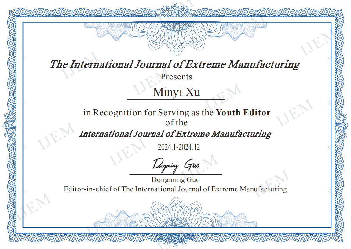 徐敏义教授受聘为International Journal of Extreme Manufacturing期刊青年编委
