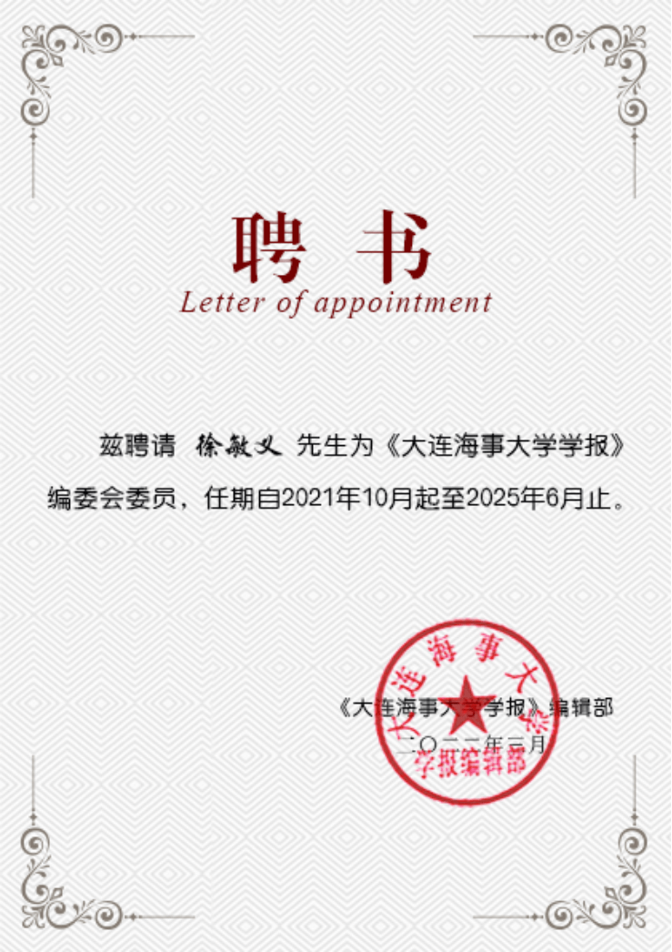 徐敏义教授受聘为《大连海事大学学报》编委会委员,任期自2021年10月起至2025年6月止。