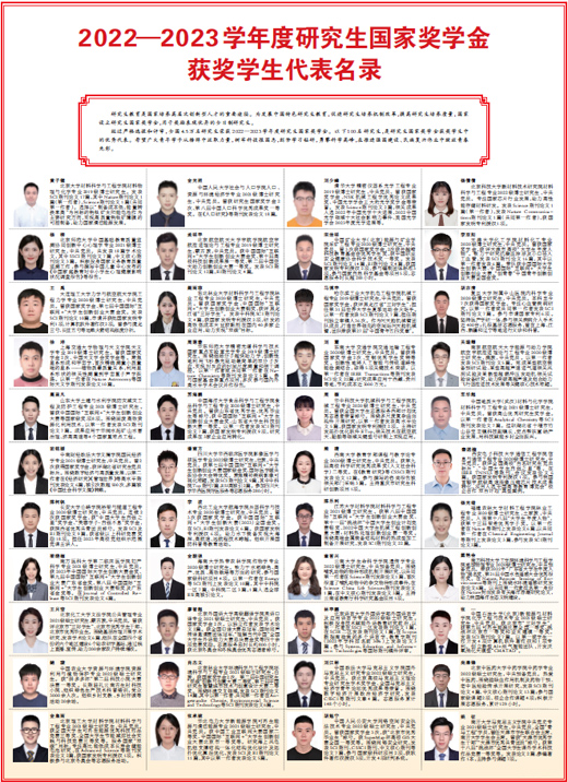 经过严格选拔和评审,全国4.5万名研究生荣获2022—2023学年度研究生国家奖学金,并选出100名研究生(实验室硕士生王昭洋入选),作为研究生国家奖学金获奖学生中的优秀代表。希望广大青年学子从榜样中汲取力量,树牢科技报国志,刻苦学习钻研,勇攀科学高峰,在推进强国建设、民族复兴伟业中绽放青春光彩。