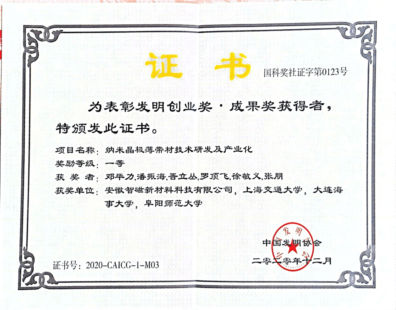 近日,中国发明协会为课题组参与的《纳米晶极薄带材技术研发及产业化》,荣获“发明创业奖·成果奖”一等奖奖。