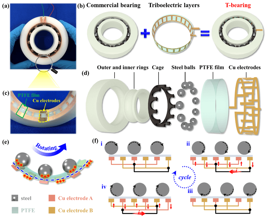图1:T-bearing的结构及工作原理。(a)T-bearing的实际照片和(b)组成示意图。(c)感知层的特写照片。(d)T-bearing的装配图。(e)TENG组成和(f)工作原理。