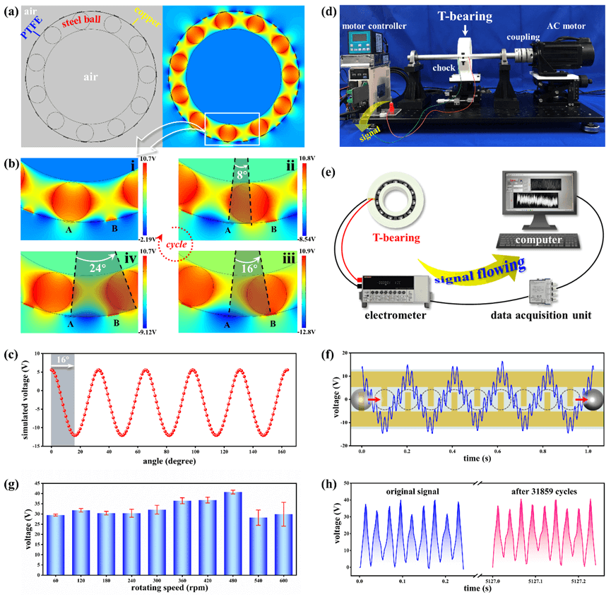 图2:T-bearing的仿真模型与实验过程。(a)COMSOL仿真的初始设置和(b)电极之间的周期性电位变化。(c)旋转一圈过程中的模拟电压。(d)测试平台的照片。(e)数据获取的流程。(f)电机转速为60rpm时T-bearing的VOC。(g)不同转速下的VOC。(h)T-bearing在31859个周期后的电压信号和初始电压信号的比较。