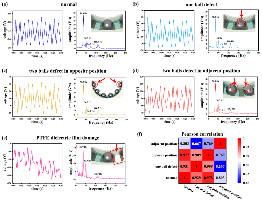 图3:不同故障下T-bearing电压信号的时频域比较:(a)正常,(b)一球缺陷,(c)两球相对位置缺陷,(d)两球相邻位置缺陷,(e)PTFE介电膜破损。(f)相似信号的相关性热图。