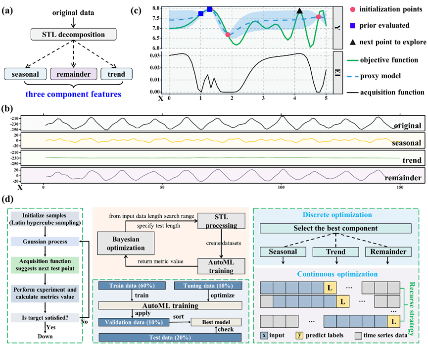 图4:摩擦电信号的分析与预测。(a)STL分解过程示意图。(b)STL分解T-bearing电压信号的三个特征分量。(c)BO过程的可视化。(d)AutoML和BO组成的直接递归预测框架。