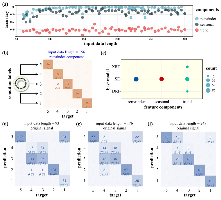 图5:AutoML模型的预测结果。(a)不同输入数据长度下各特征分量的模型精度。(b)最终优化参数下SE模型的预测精度。(c)来自AutoML的最佳模型类型分布图。(d)、(e)、(f)不同输入数据长度对原始电压信号的预测精度。