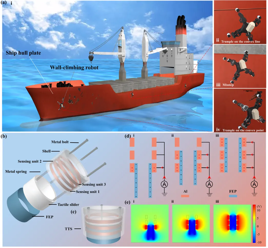 图1:摩擦电触觉传感器的结构、原理及应用。(a) (i)安装TTS的腿式磁吸附爬壁机器人。(ii)-(iv)安装在腿足式磁吸附爬壁机器人上的摩擦电触觉传感器监测到凸起、踏空、凸点。(b)摩擦电触觉传感器的结构和部件。(c)摩擦电触觉传感器图像。(d)机器人脚踩踏地面时摩擦电触觉传感器的电荷转移过程。(e)利用COMSOL软件模拟电位分布。