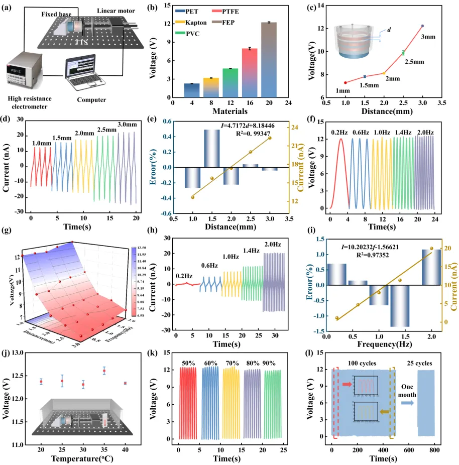图2:摩擦电触觉传感器的输出性能。(a)实验装置示意图。(b)介电材料(FEP、PTFE、PET、Kaptopn和PVC)对TTS输出的影响。电极宽度对(c) 开路电压和(d) 短路电流的影响。(e) 开路电压与电极宽度之间的拟合线性关系。外部滑动频率对(f) 开路电压和(h) 短路电流的影响。(g)外负载频率和铝电极宽度对开路电压的影响。(i) 短路电流与外部负载频率的拟合线性关系。(j)环境温度对开路电压的影响。(k)相对湿度对开路电压的影响。(l)摩擦电触觉传感器耐久性试验图。