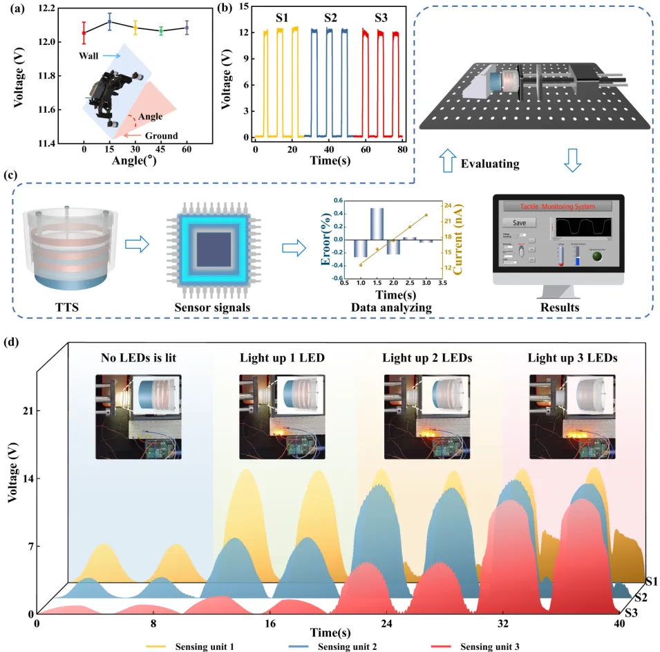 图3:摩擦电触觉传感器在外部负载监测中的应用。(a)不同倾角对感知单元3的开路电压。(b)摩擦电触觉传感器三个感知单元输出的开路电压。(c)监测触觉滑块的滑动深度的逻辑框图。(d)控制led信号灯的摩擦电触觉传感器的输出信号