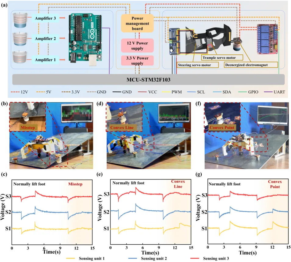 图4:TTS检测足部吸附状态的实验。(a)腿足式磁吸附爬壁机器人摩擦电触觉传感器系统原理图。(b)、(d)、(f)不同墙面下传感器配置及实验场景布局。(c)、(e)、(g)不同壁面条件下监测足部吸附状态的摩擦电触觉传感器输出信号。