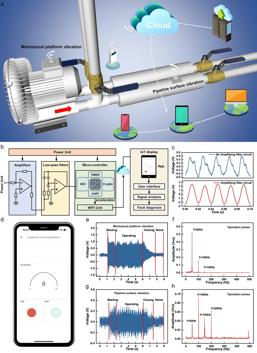 图2.HF-Teng传感器在机械振动监测中的应用。(a)HF-TENG测试平台示意图。(b)基于柔性摩擦电传感器的振动信号管理电路原理图,包括数据采集、信号处理、无线传输和信号显示。(c)使用和不使用电路的输出电压信号的比较。(d)使用手机APP进行实时振动监测的可视化平台。在(e)鼓风机和(g)管路运行期间输出HF-Teng的电压信号。(f)鼓风机和(h)管路运行时电压信号的傅里叶变换。