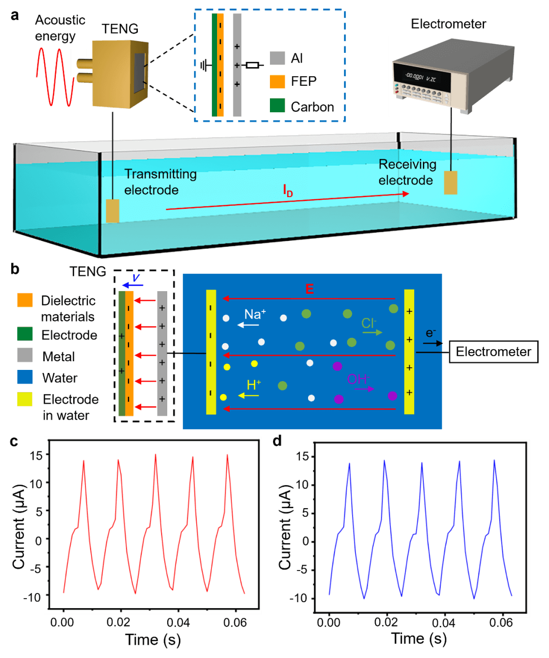 图1 基于摩擦纳米发电机的水下无线通信原理(a)实验过程示意图;(b)工作原理示意图;摩擦纳米发电机产生的(c)原始短路电流信号和(d)水下无线传输接收到的电流信号。