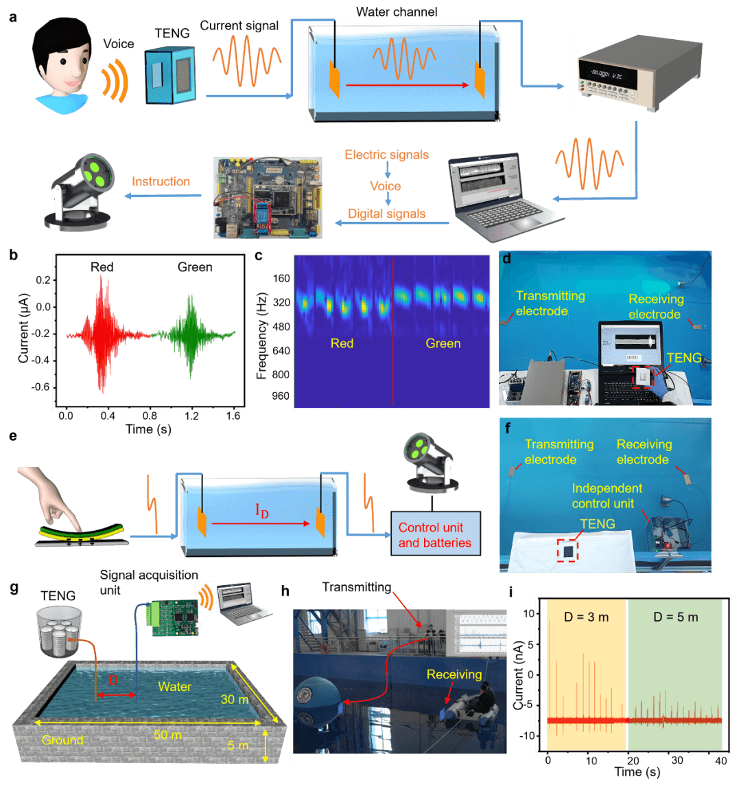 图2 水下无线通信验证实验(a)语音无线控制水下灯光原理图;(b)接收到的“red”和“green”信号;(c)对“red” 和 “green”信号进行短时傅里叶变换;(d)语音控制实验装置图;按钮式TENG水下无线控制系统(e)原理图和(f)实验图;开阔水域水下电场信号传输与检测(e)原理图、(g)实物图和水下接收到的电场信号。