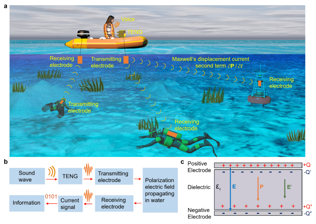 近日,大连海事大学徐敏义教授团队联合中国科学院北京纳米能源与系统研究所王中林院士、北京大学谢广明教授、清华大学丁文伯教授等合作提出了一种基于摩擦纳米发电机(TENG)的复杂水域自供能水下无线电场通信新方法。相关工作以题为“Underwater Wireless Communication via TENG-Generated Maxwell’s Displacement Current”的研究性文章在国际顶尖学术期刊《自然•通讯》(《Nature Communications》)上发表。