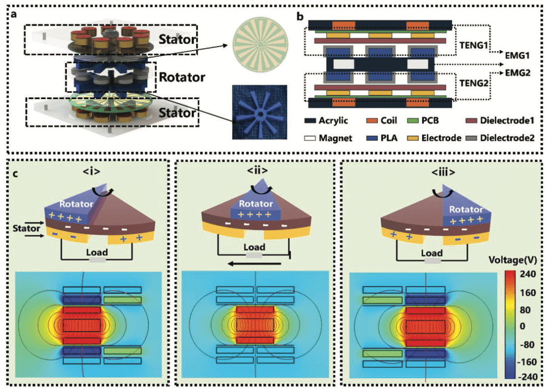 With the advent of carbon neutrality, renewable energy installations are being upgraded toward miniaturization, low cost, and high conversion efficiency. Thus, a high output triboelectric–electromagnetic hybrid generator based on in-phase parallel connection (IP-HG) is proposed. The output characteristics of both TENG (triboelectric nanogenerator) and EMG (electromagnetic generator) can be effectively complemented to provide excellent output over a wide range of operating frequencies. By connecting multiple TENGs in parallel with EMGs in the same phase respectively, cumbersome rectification elements and wiring can be eliminated, and the energy output of the device can be greatly increased. The output characteristics and advantages of the IP-HG are systematically investigated, including the material of the TENG, the rotation speed, the combination of dielectrode, and their effect on the electrical output of the IP-HG. The short-circuit current of 63 mA, open-circuit voltage of 80 V, and an instantaneous output power density of 610 W m−3 is obtained by using a full-wave rectifier circuit at 243 rpm, which can charge a 470 μF capacitor to 1 V in 0.2 s. A maximum output efficiency reaches 36.162% at 189 rpm. In addition, the IP-HG can continuously power a commercial sensor and three 5 W DC light bulbs at very low rotational speeds. The reported IP-HG offers an efficient and sustainable design approach to the development of hybrid harvesters.
