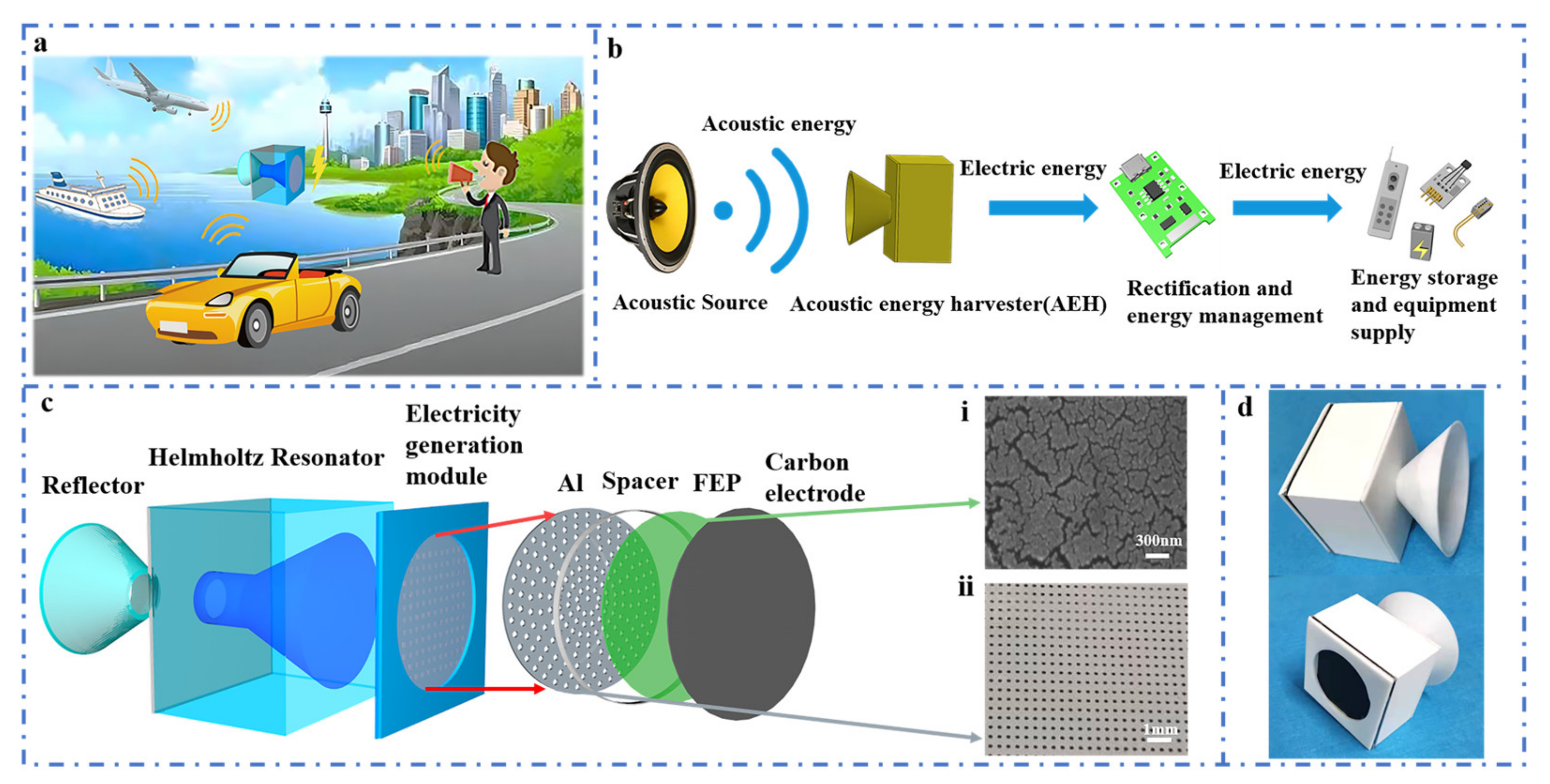Harvesting acoustic energy in the environment and converting it into electricity can provide essential ideas for self-powering the widely distributed sensor devices in the age of the Internet of Things. In this study, we propose a low-cost, easily fabricated and high-performance coniform Helmholtz resonator-based Triboelectric Nanogenerator (CHR-TENG) with the purpose of acoustic energy harvesting. Output performances of the CHR-TENG with varied geometrical sizes were systematically investigated under different acoustic energy conditions. Remarkably, the CHR-TENG could achieve a 58.2% higher power density per unit of sound pressure of acoustic energy harvesting compared with the ever-reported best result. In addition, the reported CHR-TENG was demonstrated by charging a 1000 μF capacitor up to 3 V in 165 s, powering a sensor for continuous temperature and humidity monitoring and lighting up as many as five 0.5 W commercial LED bulbs for acoustic energy harvesting. With a collection features of high output performance, lightweight, wide frequency response band and environmental friendliness, the cleverly designed CHR-TENG represents a practicable acoustic energy harvesting approach for powering sensor devices in the age of the Internet of Things.