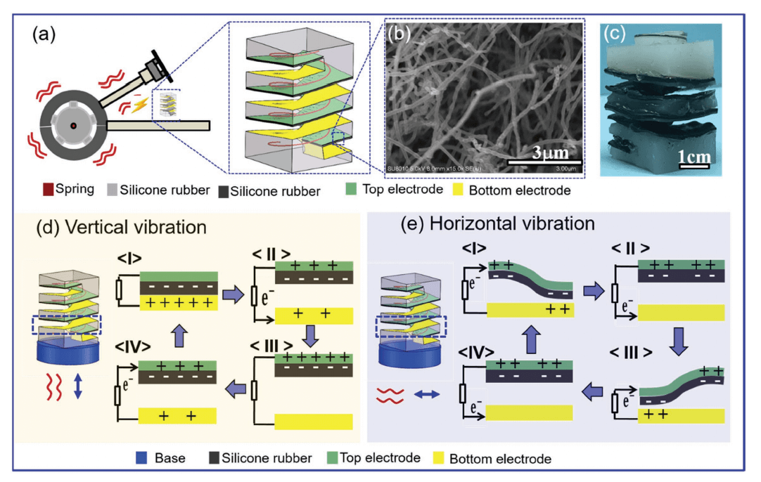 Vibration is a common mechanical phenomenon and possesses mechanical energy in ambient environment, which can serve as a sustainable source of power for equipment and devices if it can be effectively collected. In the present work, a novel soft and robust triboelectric nanogenerator (TENG) made of a silicone rubber-spring helical structure with nanocomposite-based elastomeric electrodes is proposed. Such a spring based TENG (S-TENG) structure operates in the contact-separation mode upon vibrating and can effectively convert mechanical energy from ambient excitation into electrical energy. The two fundamental vibration modes resulting from the vertical and horizontal excitation are analyzed theoretically, numerically, and experimentally. Under the resonant states of the S-TENG, its peak power density is found to be 240 and 45 mW m−2 with an external load of 10 MΩ and an acceleration amplitude of 23 m s−2. Additionally, the dependence of the S-TENG's output signal on the ambient excitation can be used as a prime self-powered active vibration sensor that can be applied to monitor the acceleration and frequency of the ambient excitation. Therefore, the newly designed S-TENG has a great potential in harvesting arbitrary directional vibration energy and serving as a self-powered vibration sensor.
