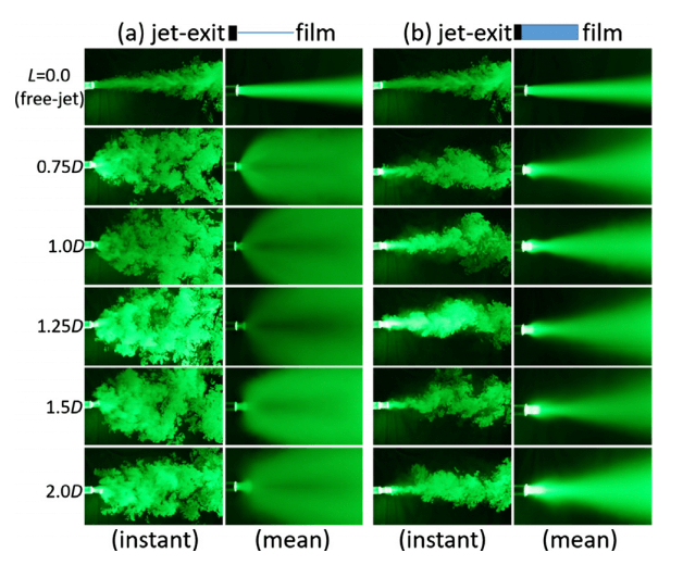 This paper reports a new type of flapping turbulent jets that are self-excited by flutter of a flexible film with a leading edge fixed axially and centrally at a round nozzle exit. Both flutter conditions of a film and flapping-jet characteristics are investigated by varying the film material and dimensions of length (L), span (S) and thickness (δ). Visual observation, flow visualization and hot-wire anemometry are used to examine the flapping jet versus the free counterpart without involving any film. Experiments are made at L/D = 0.5 ∼ 2.0 and the jet Reynolds number of Re = 10,000 to 50,000; where Re ≡ UoD/ν with D, Uo and ν being the jet-exit diameter, exit-averaging velocity and fluid viscosity, respectively.