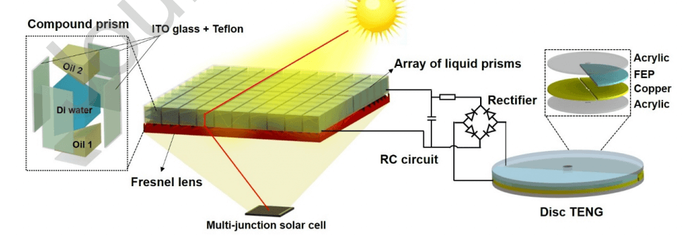 Concentrator photovoltaics (CPV) has great competitiveness in replacing the conventional flat-panel PV system due to its high conversion efficiency and small cell active area. However, the accessory beam steering and concentrating optics are bulky and costly. Here we propose a programmable compound prism (PCP) powered by triboelectric nanogenerator (TENG) for solar beam steering. A disc TENG with a RC circuit could produce DC voltage signal, and the voltage signal could be tuned by varying the resistance in RC circuit. By connecting the variable DC output to the left, right and back walls of the PCP filled with DC 550 silicone oil, DI water and PMX 200 silicone oil, the two oil/water interfaces could be modulated in a programmable manner. A maximum deflection angle range of 15° was achieved in the PCP, which is 38% greater than conventional single prism with only one oil/water interface. The proposed TENG-PCP was employed to deflect an oblique incident laser beam to trigger the power generation in a multi-junction solar cell. With the operation of the proposed TENG-PCP, a 1.2 mW increment was achieved by the multi-junction solar cell, indicating the potential of boosting the CPV by the presented TENG−PCP.