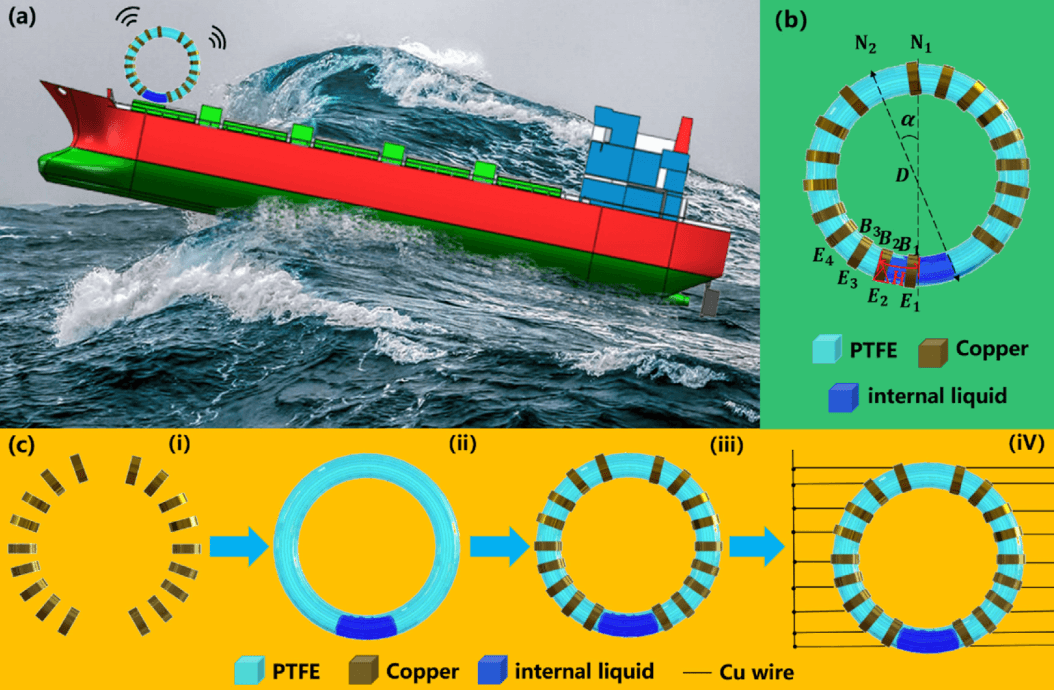 Ship's attitude information is of great significance for navigation safety, cargo handling monitoring, and operation management. It is highly desired to develop an electromechanical integrated tilt sensor which can work well under harsh environment. In this paper, a robust and self-powered tilt sensor based on annular liquid-solid interfacing triboelectric nanogenerator (TENG) is to be proposed and systematically investigated. The TENG tilt sensor is composed of an annular polytetrafluoroethylene (PTFE) tube with copper electrodes segment disposed on the surface and the internal liquid which is encapsulated in PTFE tube with no air bubble. Studies on electrode width and liquid type are conducted to reasonably design the TENG sensor structure and improve its sensitivity. By conducting the durability test, the TENG tilt sensor demonstrates stable output performance and high sensitivity characteristics in low-frequency and low-amplitude inclination conditions. Moreover, the TENG tilt sensor hardly fails due to parts wear since there are no moving parts in it. The advantage of durability, maintenance-free, and independent with the external environment are highlighted in a harsh environment with high humidity, high salinity and strong magnetic field. Therefore, the present TENG tilt sensor is of practical significance for improving the automation and intelligence of ships.