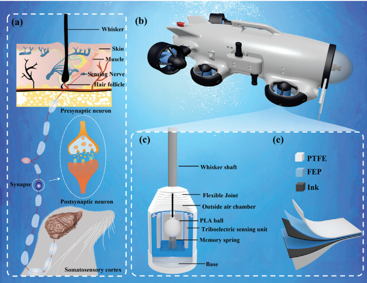 This work introduces a deep learning-assisted triboelectric whisker sensor array (TWSA) for 3D motion estimation and near-field perception in unmanned underwater vehicles. The TWSA detects flow velocity and direction. It achieves 81.2% accuracy in wake vortex detection and enables precise 3D trajectory estimation with a root mean square error of 0.02, significantly enhancing underwater vehicle navigation capabilities. image