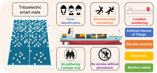 Monitoring the crew of a ship can be performed by combining sensors and artificial intelligence methods to process sensing data. In this study, we developed a deep learning (DL)-assisted minimalist structure triboelectric smart mat system for obtaining abundant crew information without the privacy concerns of taking video. The smart mat system is fabricated using a conductive sponge with different filling rates and a fluorinated ethylene propylene membrane. The proposed dual-channel measurement method improves the stability of the generated signal. Comprehensive crew and cargo monitoring, including personnel and status identification, as well as positioning and counting functions are realized by the DL-assisted triboelectric smart mat system according to the analysis of instant sensory data. Real-time monitoring of crews through fixed and mobile devices improves the ability and efficiency of handling emergencies. The smart mat system provides privacy concerns and an effective way to build ship Internet of Things and ensure personnel safety.