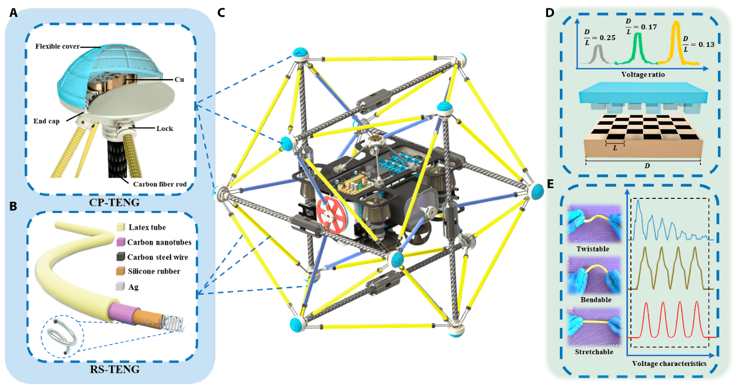 The growth of underwater robotic applications in ocean exploration and research has created an urgent need for effective tactile sensing. Here, we propose an underwater 3-dimensional tactile tensegrity (U3DTT) based on soft self-powered triboelectric nanogenerators and deep-learning-assisted data analytics. This device can measure and distinguish the magnitude, location, and orientation of perturbations in real time from both flow field and interaction with obstacles and provide collision protection for underwater vehicles operation. It is enabled by the structure that mimics terrestrial animals’ musculoskeletal systems composed of both stiff bones and stretchable muscles. Moreover, when successfully integrated with underwater vehicles, the U3DTT shows advantages of multiple degrees of freedom in its shape modes, an ultrahigh sensitivity, and fast response times with a low cost and conformability. The real-time 3-dimensional pose of the U3DTT has been predicted with an average root-mean-square error of 0.76 in a water pool, indicating that this developed U3DTT is a promising technology in vehicles with tactile feedback.