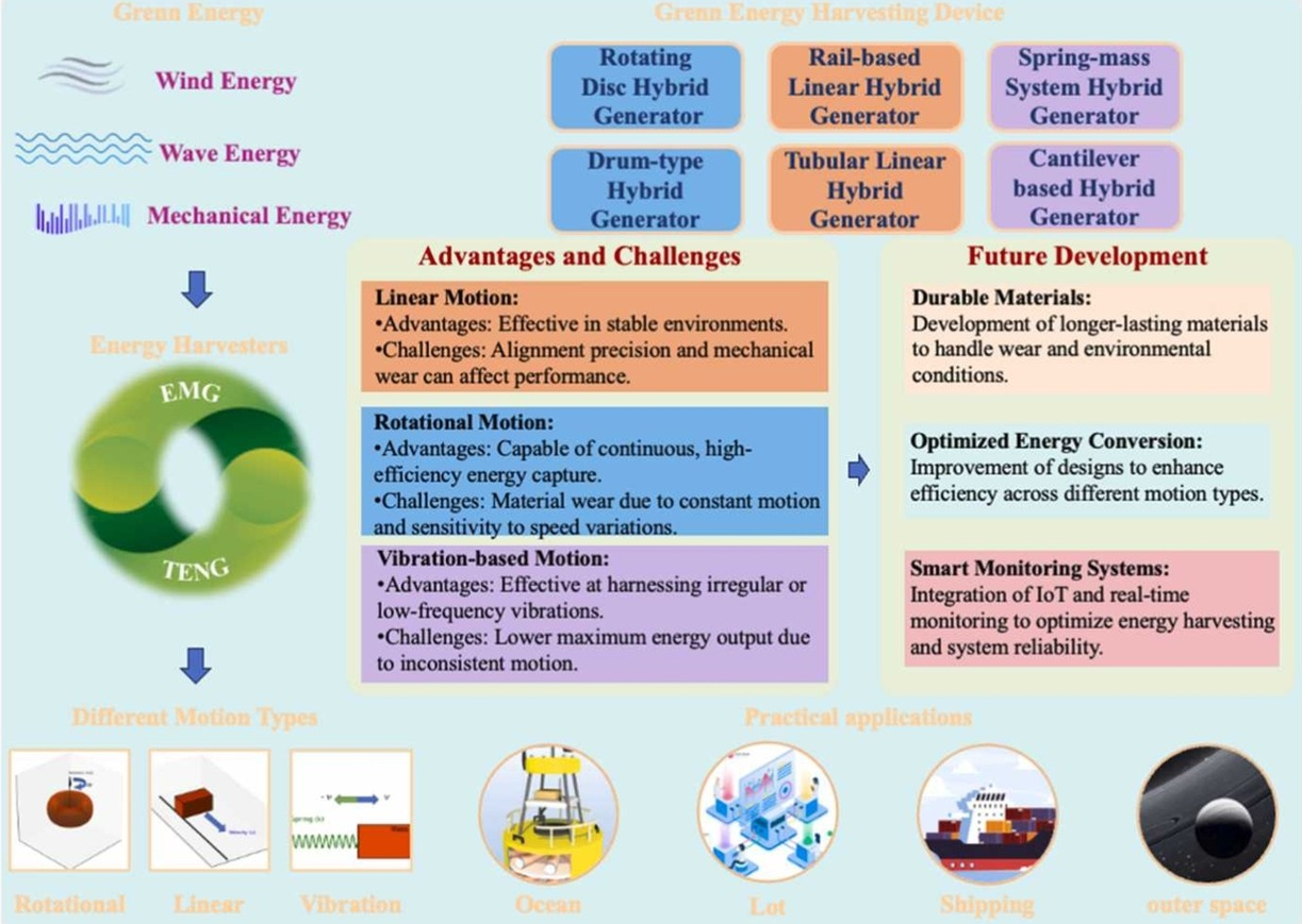 This review paper explores the integration of electromagnetic generation (EMG) and triboelectric nanogeneration (TENG) technologies, emphasizing their classification based on motion types: linear, rotational, and vibration-based. By examining each motion type, we highlight the unique characteristics, advantages, and challenges associated with hybrid EMG-TENG systems. Linear motion devices are particularly effective in harnessing energy from predictable sources, such as ocean waves, demonstrating moderate power outputs suitable for marine applications. Rotational motion devices excel in environments with continuous high-speed motions, achieving higher energy outputs, especially in wind energy systems. In contrast, vibration-based devices capture energy from irregular and low-frequency movements, offering versatility for applications in vehicles and wearable electronics. The review also discusses recent developments in hybrid systems, showcasing advancements in materials and designs that enhance energy capture and efficiency. Despite the progress, challenges remain, including mechanical wear, environmental influences, and the need for precise alignment. By understanding the complementary nature of EMG and TENG technologies, this review highlights how their integration can address the limitations of each technology. EMG excels in capturing high-speed, continuous motion, while TENG is more effective for low-frequency and irregular motion, allowing hybrid systems to efficiently harvest energy in diverse environments. Ultimately, the findings suggest that the strategic integration of EMG and TENG technologies can contribute significantly to sustainable energy solutions, paving the way for innovative developments in energy harvesting.