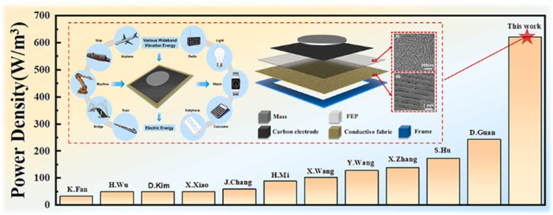 It is highly desired to develop high performance vibration energy scavengers to power amounted and distributed sensors along with the era of Internet of Things. This study proposes a novel additional mass enhanced film structure triboelectric nanogenerator (AMF-TENG) for efficiently scavenging broadband vibration energy. The AMF-TENG is composed of an additional mass, a fluorinated ethylene propylene (FEP) film with a carbon electrode, and a conductive fabric fixed on a hollow frame. The additional mass can enhance the electrical output of the AMF-TENG by 25.5 times due to the vibration amplitude and contact forces between the FEP film and conductive fabric are greatly amplified. The utilization of a hollow frame makes the electrical output of AMF-TENG 150% higher than the enclosed frame. Theoretical analysis and experimental studies were carried out to investigate the design parameters. The experimental results indicate that the AMF-TENG shows good electrical performance in the broadband frequency range from 15 to 70 Hz. Under the vibration condition of 40 Hz and 30 m/s2, it can generate a maximum power density of 622.59 W/m3, which is higher than previous studies by 155.2%. Finally, the AMF-TENG is proven to power temperature and humidity sensors continuously under actual machine vibration. In brief, the AMF-TENG provides a new method for efficiently scavenging of vibration energy in the broadband frequency range.
