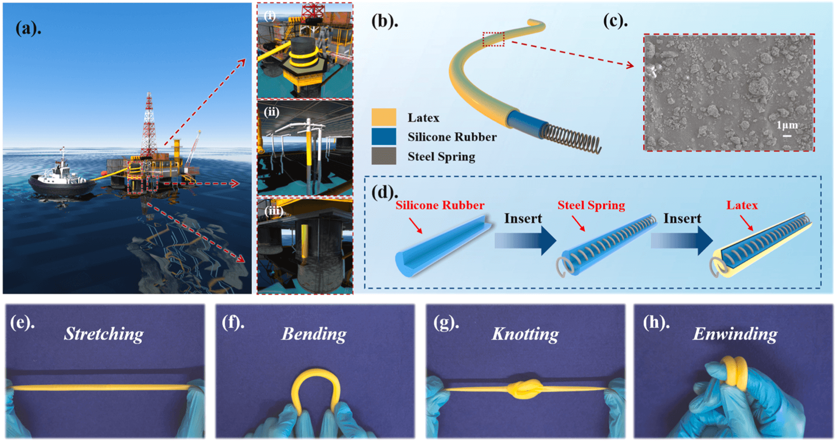 Real-time monitoring in marine structures is vital to prevent maritime accidents. In this study, a highly-stretchable rope-like triboelectric nanogenerator (R-TENG) is proposed and investigated to monitor the mechanical loads of marine structures. The designed R-TENG is composed of outer latex tube and inner silicone rubber core. A series of experiments reveal that the voltage output of the R-TENG increases linearly with the strain in the elastic region of 140%. In addition, the R-TENG can also respond well to other mechanical stimuli such as bending and pressing. More importantly, the electrical output of the R-TENG can remain almost constant even under 93% humidity atmosphere. Finally, the R-TENG has been successfully demonstrated in monitoring the typical mechanical loads in marine structures, including stretching, colliding and bending. Therefore, this R-TENG can be utilized as an alternative sensor to realize the self-powered monitoring in marine structures.