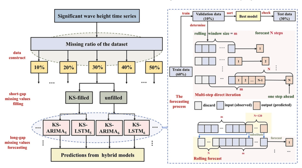 Continuous recordings of significant wave height (SWH) are of significant importance to facilitate the development and application of wave energy assessments. However, SWH recording is often interrupted by a variety of factors, including severe weather, apparatus failure, etc. The presence of short-term intermittent and longterm continuous missing values is recognized as a significant challenge for the accurate analysis and energy assessment of wave data. To effectively fill in the short- and long-term missing values simultaneously, a hybrid Kalman smoothing (KS) Long Short-Term Memory (LSTM) model, which is applied to fill in SWH for the first time, is proposed. Initially, the short-term intermittent missing values, with missing ratios of 10%-50%, are filled by using the KS method, achieving a root mean square error (RMSE) as low as 0.082. Based on short-term missing values addressed by KS, the LSTM model is introduced to effectively predict the long-term continuous missing values. The maximum RMSE reduction rate of KS-LSTM is reduced by 49.6%, 59.4%, and 57.8% compared to KSARIMA, LSTM, and ARIMA, respectively, within the short-term intermittent missing ratios of 10%-50%. The maximum reduction in mean square error (MSE) is observed to be 71.4%, 83.6%, and 82.1%. Similarly, the maximum reduction in mean absolute error (MAE) is 74.6%, 61.1%, and 55.5%. The lowest prediction RMSE of long-term missing values by KS-LSTM is only 0.091, which demonstrates that the effectiveness of filling in both short-term and long-term missing values simultaneously by the KS-LSTM.