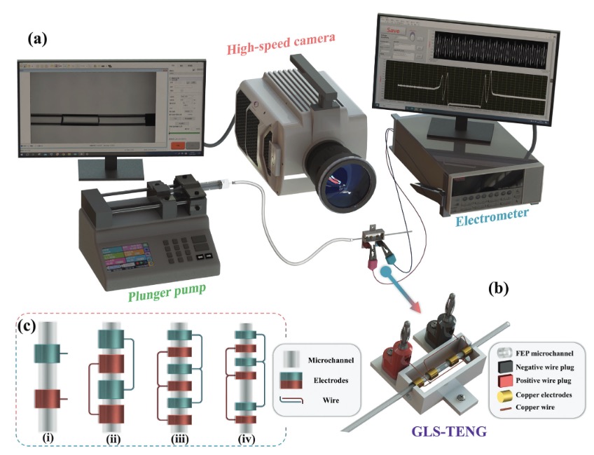 The precision in controlling fluid flow is crucial for the efficiency of microchannel devices. Consequently, it is essential to monitor the fluid within microchannels in real time. However, the microchannel flow's susceptibility to disturbance and small size present challenges in sensing. A Liquid-Solid Triboelectric Nanogenerator (TENG) with grating electrodes is proposed for non-invasive sensing of liquid plug movements in microchannels and is suitable for use with opaque channels. This sensor operates on the principle of initiating multiple pulse signals via grating electrodes. And analyze the motion of the liquid plug by the time difference between the signal peaks. It facilitates the measurement of liquid plug count, average speed, average acceleration, and the detection of flow direction. The liquid plug counters, and flow direction sensors yielded clear and distinguishable signals. The liquid plug average speed sensor achieves a 95% accuracy rate, and the acceleration sensor accurately distinguishes speed trends of the liquid plug with more than 85% precision. Grating electrodes are effectively employed for motion sensing. Analyzing the motion of an object by the time difference between voltage peaks offers greater stability than voltage magnitude analysis. Four portable prototypes are designed to make them applicable for fluid sensing in microchannel devices.