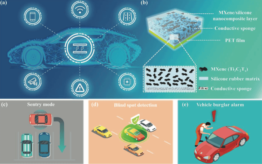 With the ongoing advancement in sensor technologies, the development of intelligent, secure, and low-carbon vehicles will be possible in the near future. However, providing continuous power to numerous onboard sensors consumes substantial amounts of power from vehicle, resulting in the shortened running times. Herein, a self-powered noncontact triboelectric nanogenerator (SNC-TENG) with ultralong-distance detection and a high sensitivity is proposed, which can be used as ambient perception sensors for smart vehicles. The SNC-TENG is constructed from a MXene/silicone nanocomposite with a fully embedded conductive sponge, which significantly enriches the tribo-charges and leads to an excellent capability and performance. This SNC-TENG is capable of perceiving human activity from a distance of 2 m. To the best of authors knowledge, the perceiving distance per unit area of this SNC-TENG is the highest among previously reported non-contact TENGs. Furthermore, the applicability of the SNC-TENG is explored for vehicle sentry mode and blind spot detection for the first time. The use of this technology in a real vehicle demonstrates its feasibility for use in practical applications. Overall, this study provides a new design scheme for contactless self-powered sensors, and the presented SNC-TENG is expected to be applicable in various fields where non-contact sensing is required.