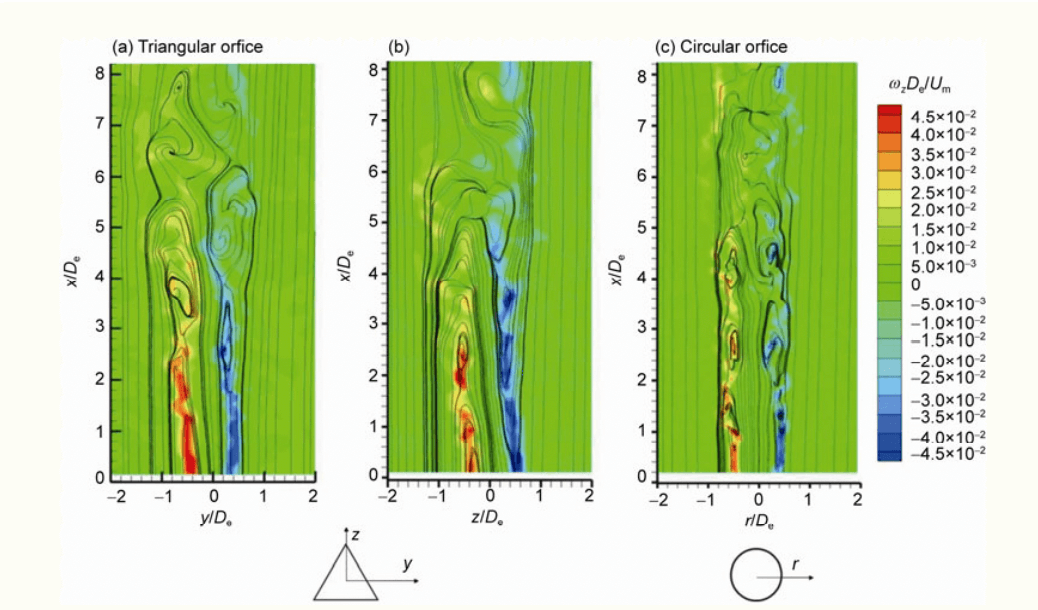The present study experimentally investigated the near-field flow mixing characteristics of two turbulent jets issuing from equilateral triangular and circular orifice plates into effectively unbounded surroundings, respectively. Planar particle image velocimetry (PIV) was applied to measure the velocity field at the same Reynolds number of Re=50,000, where Re = U e D e/ν with U e being the exit bulk velocity and ν the kinematic viscosity of fluid, D e the equivalent diameters. The instantaneous velocity, mean velocity, Reynolds stresses were obtained. From the mean velocity field, the centreline velocity decay rate and half-velocity width were derived. Comparing the mixing characteristics of the two jets, it is found that the triangular jet has a faster mixing rate than the circular counterpart. The triangular jet entrainments with the ambient fluid at a higher rate in the near field. This is evidenced by a shorter unmixed core, faster Reynolds stress and centreline turbulence intensity growth. The primary coherent structures in the near field are found to break down more rapidly in the triangular jet as compared to the circular jet. Over the entire measurement region, the triangular jet maintained a higher rate of decay and spread. Moreover, all components of Reynolds stress of the triangular jet appear to reach their peaks earlier, and then decay more rapidly than those of the circular jet. In addition, the axis-switching phenomenon is observed in the triangular jet.