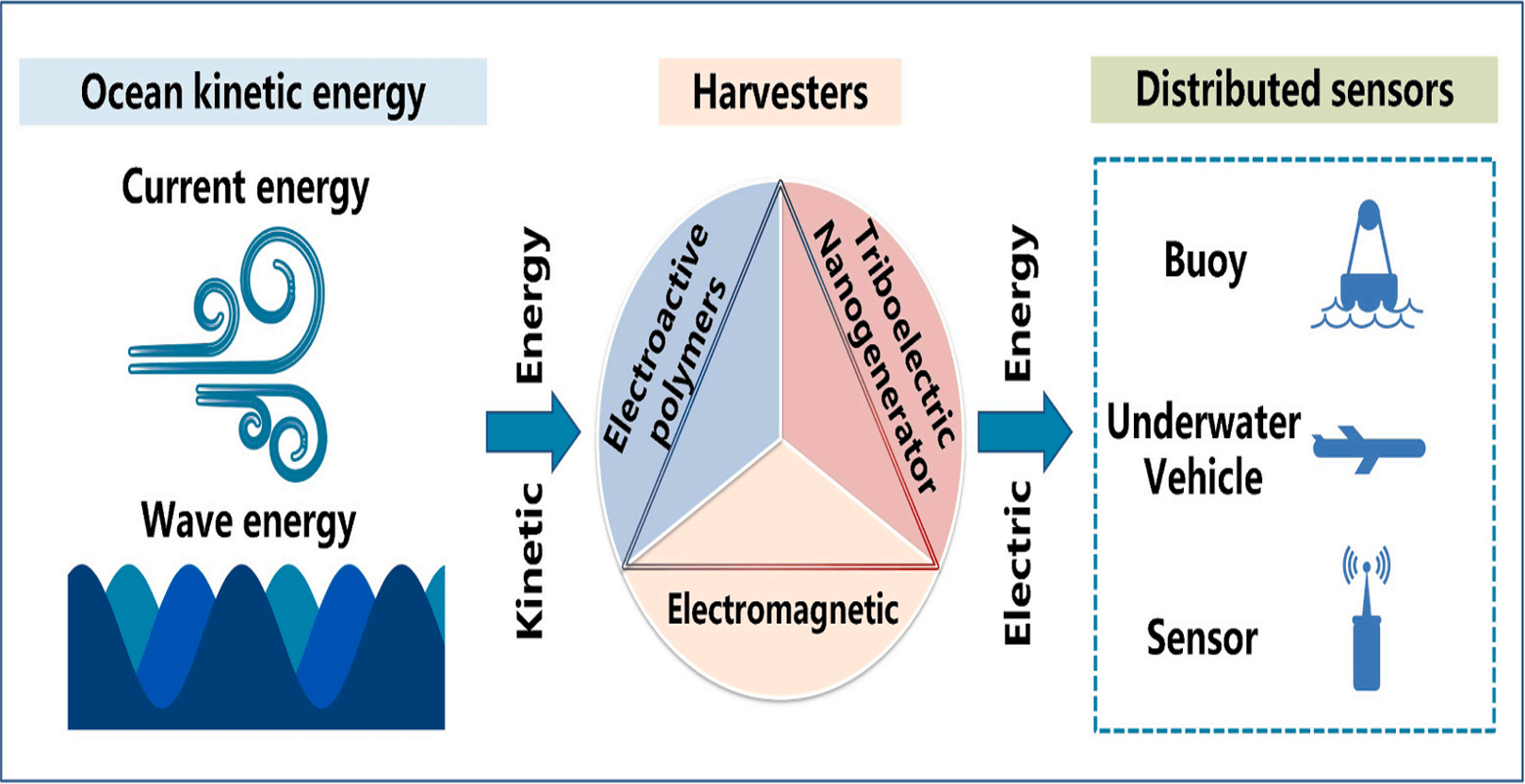 Oceanography has received a lot of attention in the 21st century. Due to the harsh and complex ocean conditions, ensuring power supply to the distributed marine equipment has become a critical challenge. The ocean kinetic energy harvester (OKEH) has made favorable progress in powering ocean sensors by harvesting blue energy. The latest developments in the electromagnetic harvester (EMH), electroactive polymers harvester (EAH), triboelectric nanogenerator (TENG), and hybrid harvester (HH) are reviewed in this study. This study analyzes the working principles and output performance of the OKEH as well as highlights the future challenges of and perspectives on the OKEH. Based on the comparison of OKEHs, this study indicates that TENG is favorable for harvesting low-frequency, low-amplitude, and random-direction wave energy (called high entropy energy).