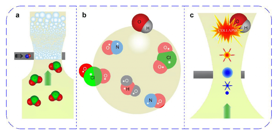 Ships carry over 80% of the world’s trade, and in the meantime, they cause severe air pollution. Nitrogen oxide (NOx) is one of the most difficult items to be treated among ship’s air pollutants. In this paper, a novel treatment of gaseous pollutants based on hydrodynamic cavitation is proposed and systematically investigated. In comparison with the bubbling reactor, the hydrodynamic cavitation reactor (HC reactor) expanded the gas-liquid contact area by more than 37.5 times through generating microbubbles (about 0.50 mm) filled with the nitric oxide mixture (Gas-Filled-Bubbles). The small space inside the Gas-Filled-Bubble facilitated collisions of gas molecules, and thus accelerated the rate of gas phase chemical reactions. Furthermore, the collapse of cavitation bubbles (Cavities) may result in highly reactive free radicals and microjets, and the microjets helped to enhance gas-liquid mass transfer. The HC reactor had a longer duration for NOx removal rate over 90% than the bubbling reactor. When 1.0 mg/L chlorine dioxide (ClO2) solution was used, the duration for NOx removal rate over 90% was 100 s in the HC reactor, whereas in the bubbling reactor the duration was 0 s. Comparatively high ClO2 concentration contributed to prolonged high NOx removal rate (>=90%) duration, however, the escape of ClO2 would lead to more nitrogen dioxide (NO2) production, and poor ClO2 utilization. The effects of the inlet and outlet pressures of the HC reactor on the denitrification effect were studied, and the cost-effectiveness of the proposed method was assessed. The results showed that the inlet pressure of 3.00 bar and the outlet pressure of 0.30 bar were reasonable options for HC reactor’s denitration when both cost benefit and application conditions were taken into account.