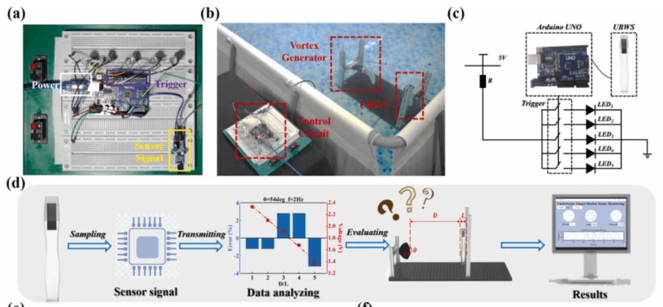 Seals, as well as other terrestrial and marine animals, utilize their whiskers as key tactile sensors to locate and track underwater wakes. Herein, an underwater bionic whisker sensor (UBWS) based on triboelectric nanogenerator was designed for capturing complex stimuli produced by moving aquatic species and using the acquired signals to follow their hydrodynamic trails. The UBWS is inspired by the structural properties of seal whiskers and incorporates a free-standing triboelectric nanogenerator, which gives it ability to capture vortices passively. The design of the UBWS is fully flexible and self-powered, which eliminates the need for an external power source while retaining the capability of high sensitivity to stimuli. Moreover, the output signal’s interaction with the movement parameters was highly correlated, and this principle was utilized to determine the relative motion state of an underwater moving object. Experiments demonstrated that the developed UBWS was capable of perceiving the hydrodynamic trails created by moving objects underwater. These new insights into the biological foundation of tactile perception through whiskers provide new design criteria for developing efficient underwater robotic sensors.