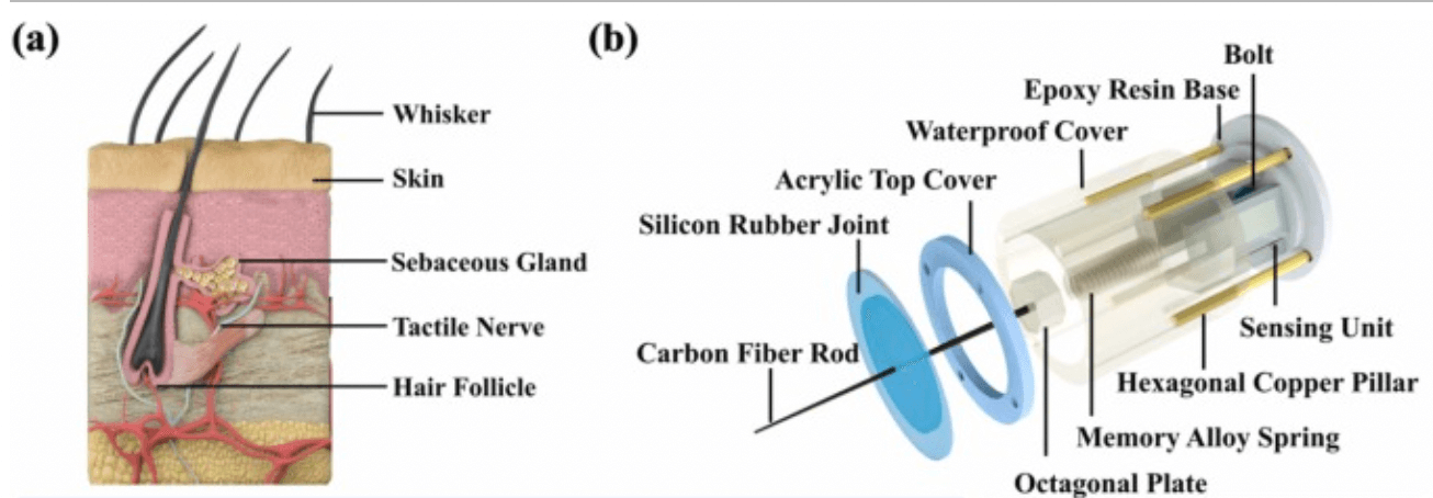 As key devices for underwater robot to perceive underwater environments, tactile sensors play an important role in seabed exploration. Inspired by the structure of marine mammal whiskers, we designed a bio-inspired whisker sensor (BWS) based on triboelectric nanogenerators to assist underwater robots in sensing underwater environments. The proposed device generated electrical signals through triboelectric and electrostatic induction between a fluorinated ethylene propylene film and ink. With the assistance of a structural design inspired by biology, the artificial BWS could estimate the external stimulation area. We demonstrated specific functions of the sensor, such as LED lights control and real-time external load monitoring to demonstrate its utility. Moreover, the BWS installed in underwater robots identify the direction, position, and frequency of external loads by extracting the characteristics of electrical signals, particularly in cases when optical and acoustic devices cannot be used, such as in turbid water. The results showed that the BWS can serve as an underwater whisker sensor for underwater robots for perceiving underwater environment and avoiding reactive obstacles.