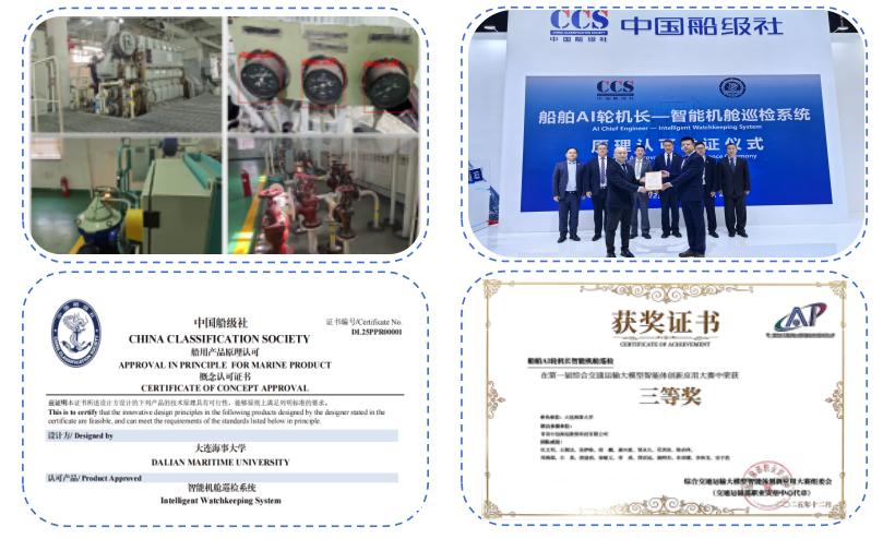系统已完成核心功能的整体设计、原理验证和实验条件下技术测试,整体成熟度达到关键技术验证阶段。系统已实现巡检路径覆盖与自主巡航,并具备多模态感知、智能仪表识别、大模型辅助决策以及机械臂辅助作业等能力。相关成果已获得中国船级社颁发的原理认可证书,并在综合交通运输大模型智能体创新应用大赛中获得全国三等奖,为后续实船应用和工程推广奠定了基础。